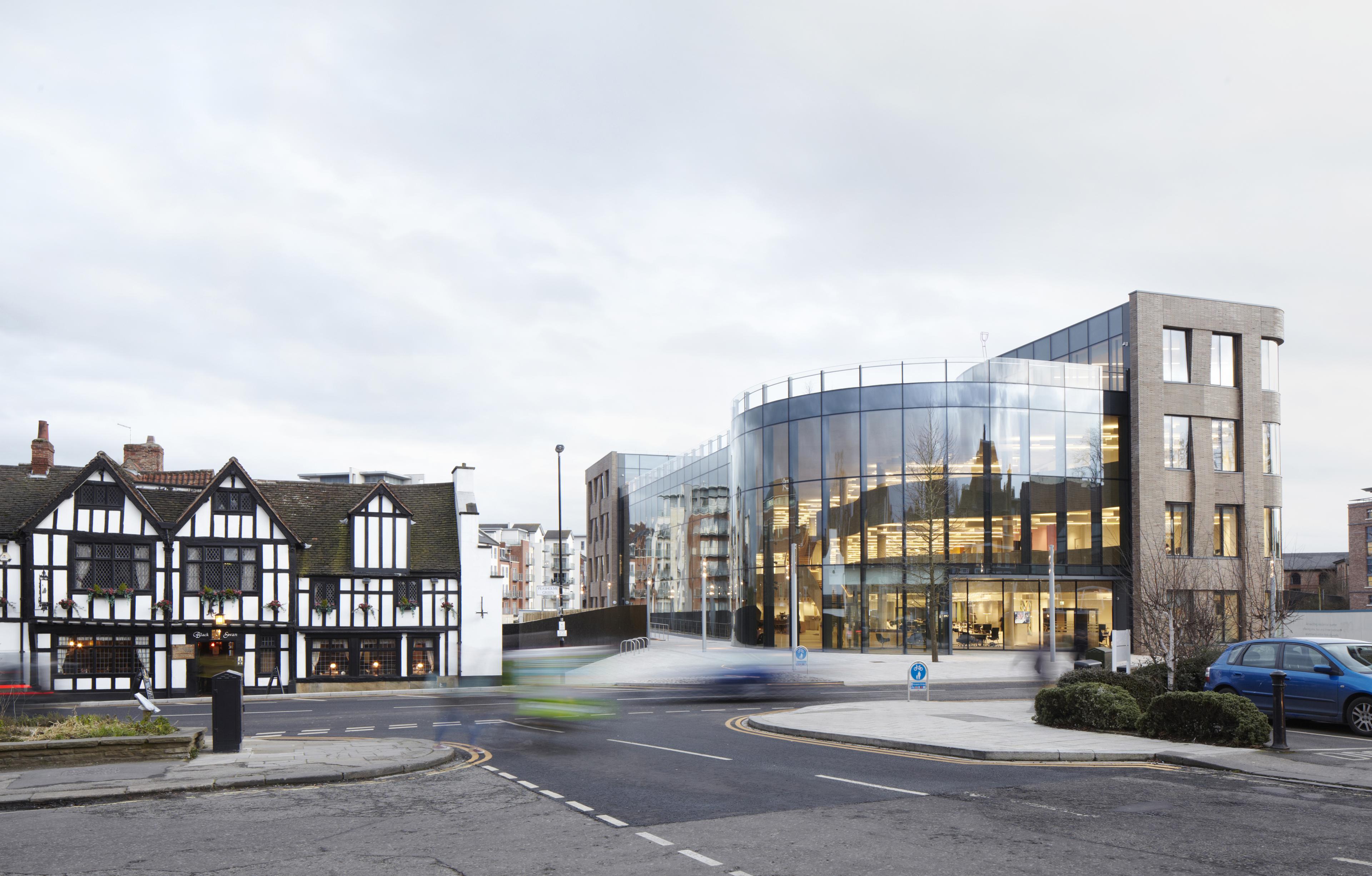 The new underwriting and customer experience centre for global insurer Hiscox sits in the heart of historical York. The building’s design takes its cues from the city’s rich heritage, with a ribbon-like central staircase inspired by the Roman city wall and a brick weave facade that references the area’s 19th-century wool market. The deferential massing creates space between the neighbouring 15th-century pub The Black Swan and allows for a new footpath towards the River Foss.