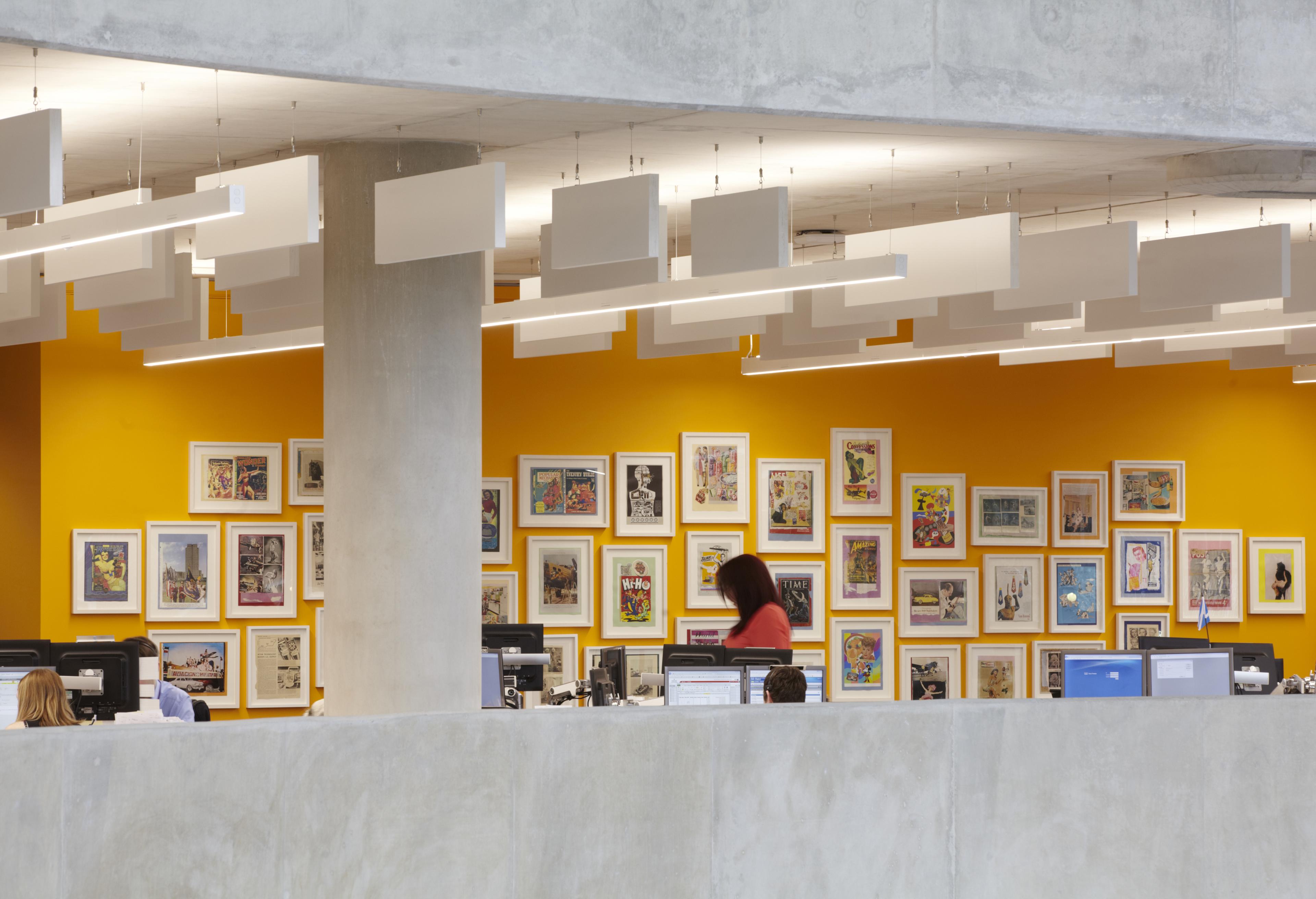 First floor workspace with an ‘art wall’ that conceals staff locker space.