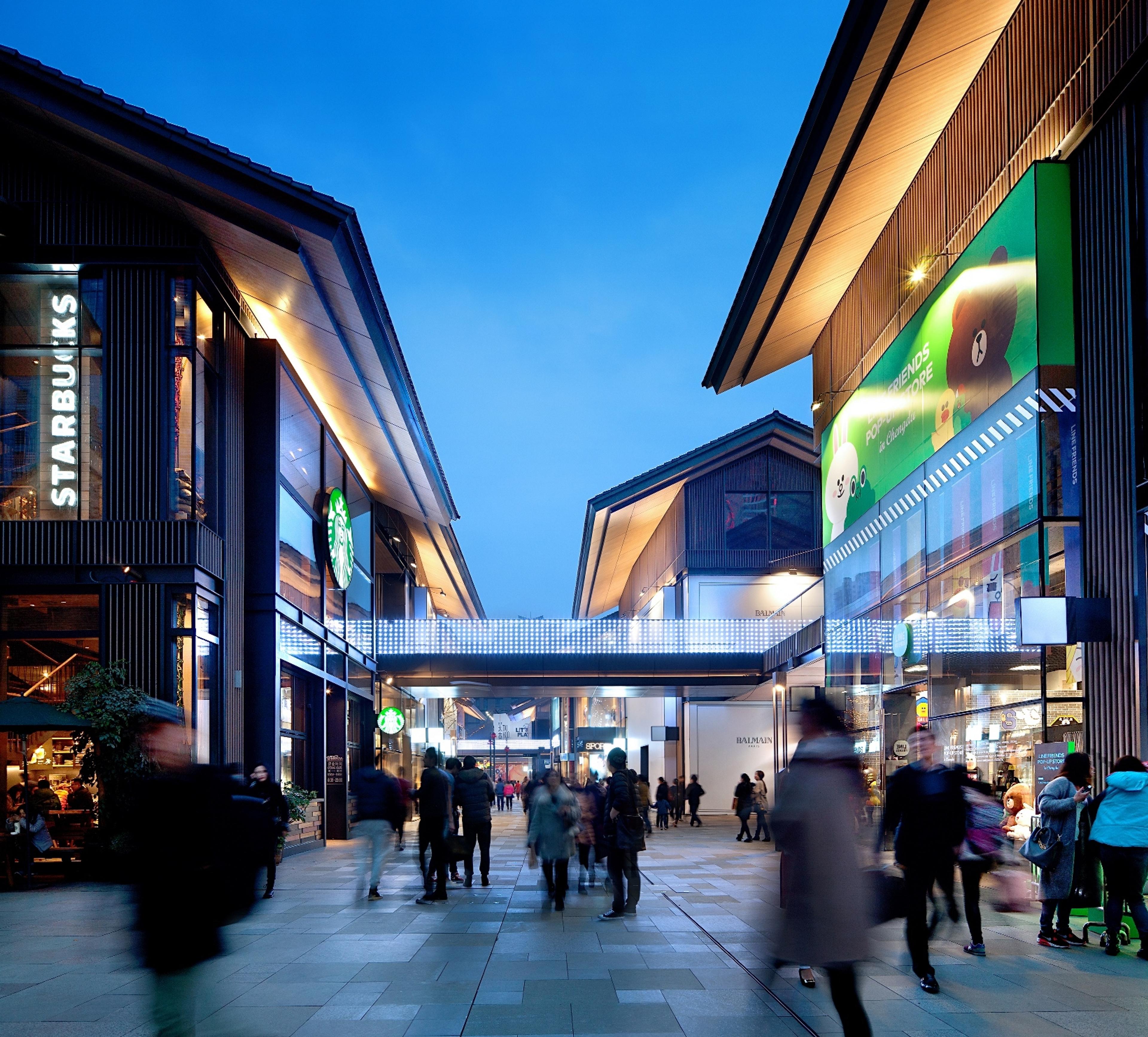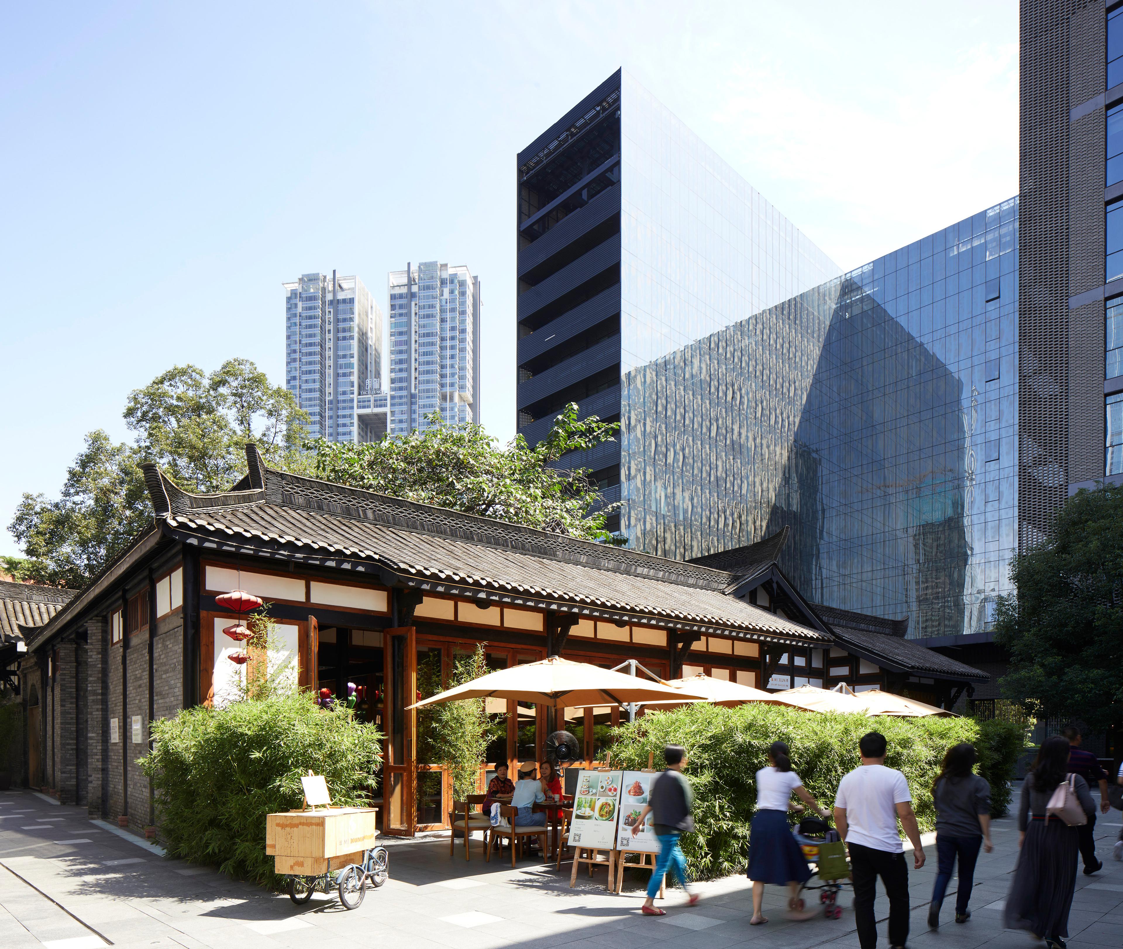 The masterplan is very clever and very beautifully done. It’s a complex of buildings anchored on the lower ground floor by the shopping centre and connected by a network of slow and fast lanes. This arrangement is inspired by historic configurations in Chengdu, where little shops and restaurants have traditionally been connected by wide and narrow lanes. That concept is integrated into the masterplan in a contemporary way. Some of the routes are slower, with external seating for cafés and restaurants, while other are meant to be transitional spaces that you move through at pace.