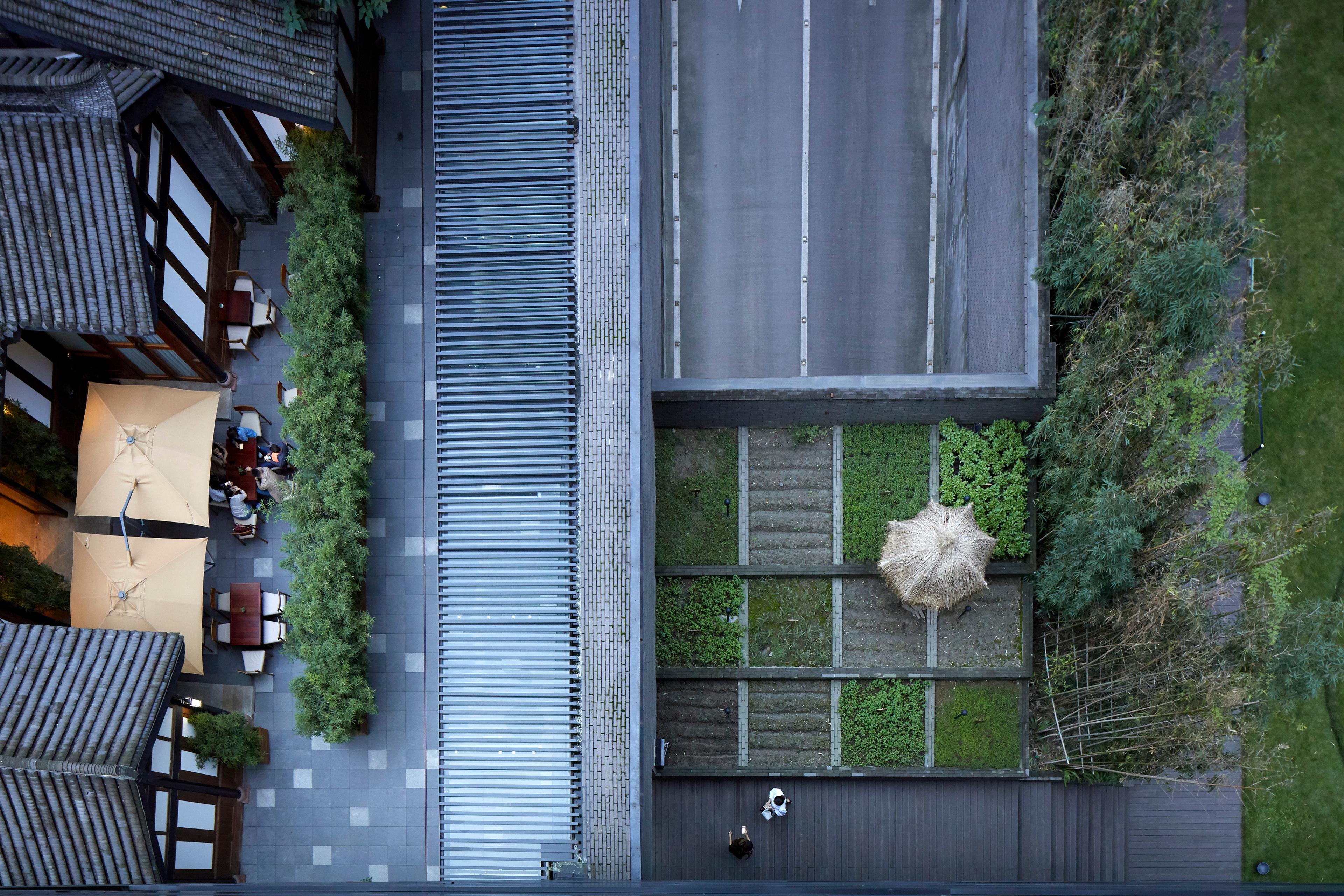 There are two L-shaped buildings, one containing the hotel and the other a serviced apartment building. Both are folded around the Qing Dynasty building, which houses the guest reception, a library and workspace, and a gallery for temporary exhibitions. Two connected spa buildings sit adjacent to the hotel, with treatment rooms arranged around internal courtyards. One of the courtyards is busy and lively, while the other is quiet and serene, offering contrasting experiences.