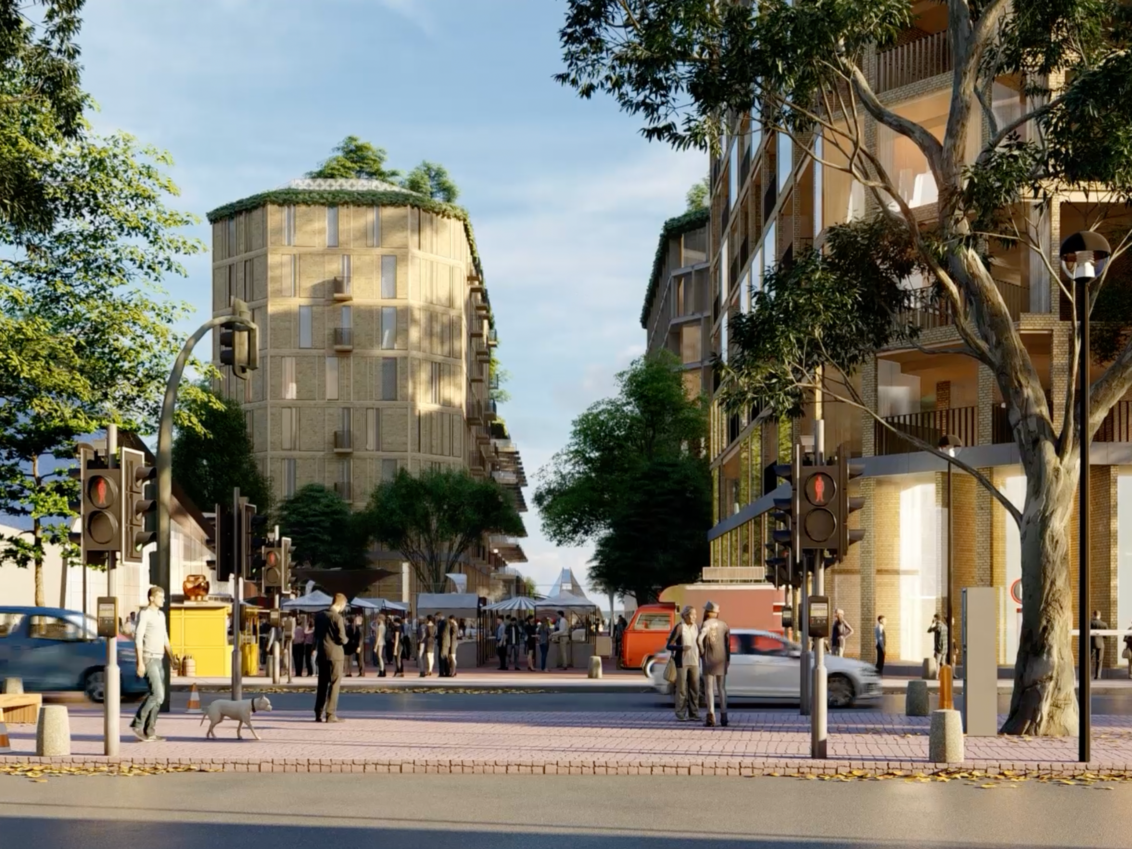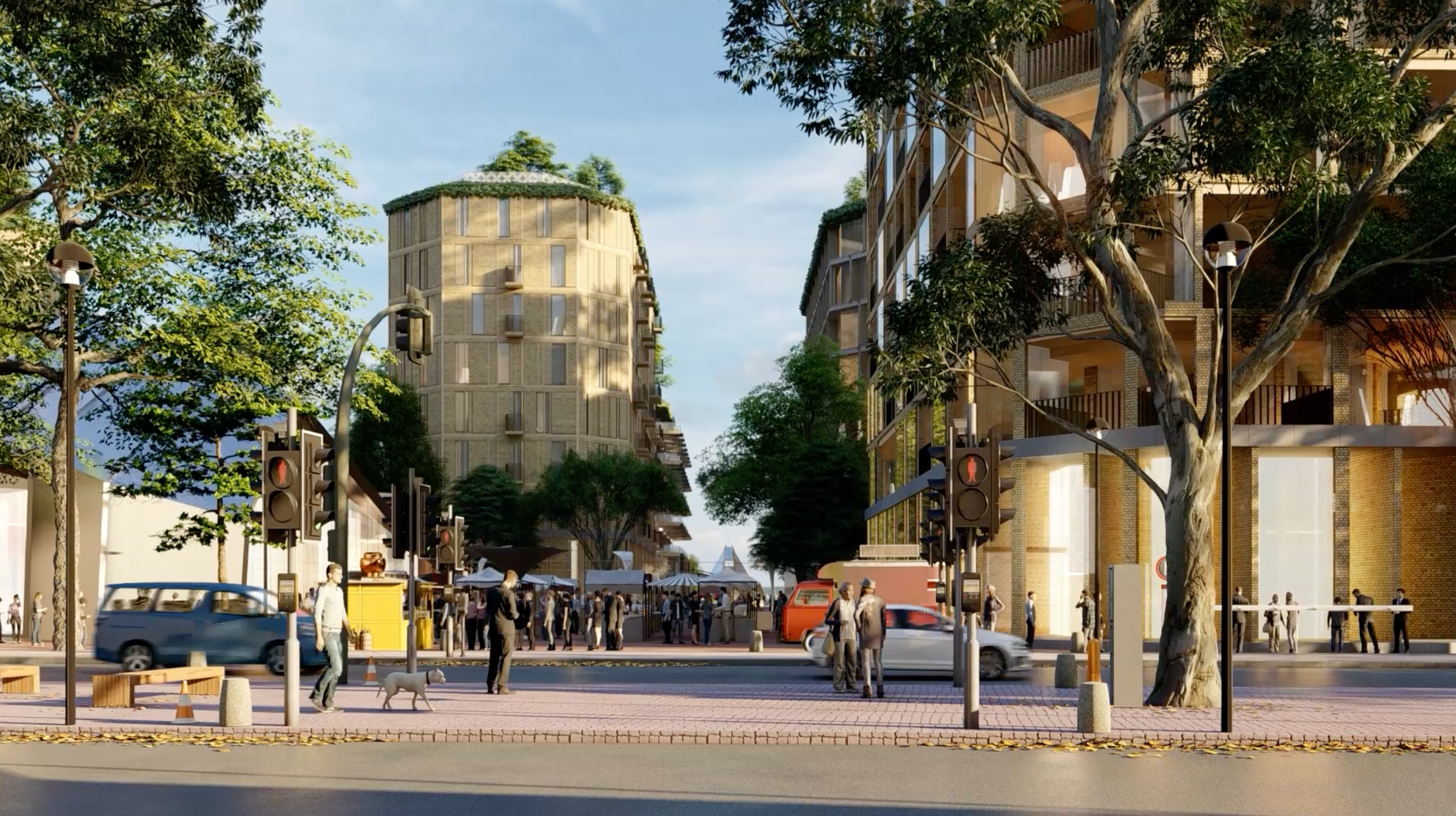 “The idea was to make the spine a performative and multipurpose landscape, introducing a softer space with a different character from the more urban ‘stitches’ that connect with the town centre,” says Simon. “The integrated community functions and residential front gardens create an inclusive space where people can socialise from their doorstep and interact with neighbours.” Greening and growing initiatives will provide opportunities for hyperlocal food production, with produce sold at local markets, while native plant species will support urban wildlife. A number of sustainable drainage solutions such as bioswales are integrated into the landscape design to reduce the risk of flooding from development, manage water quality, and boost biodiversity by creating new wildlife corridors.