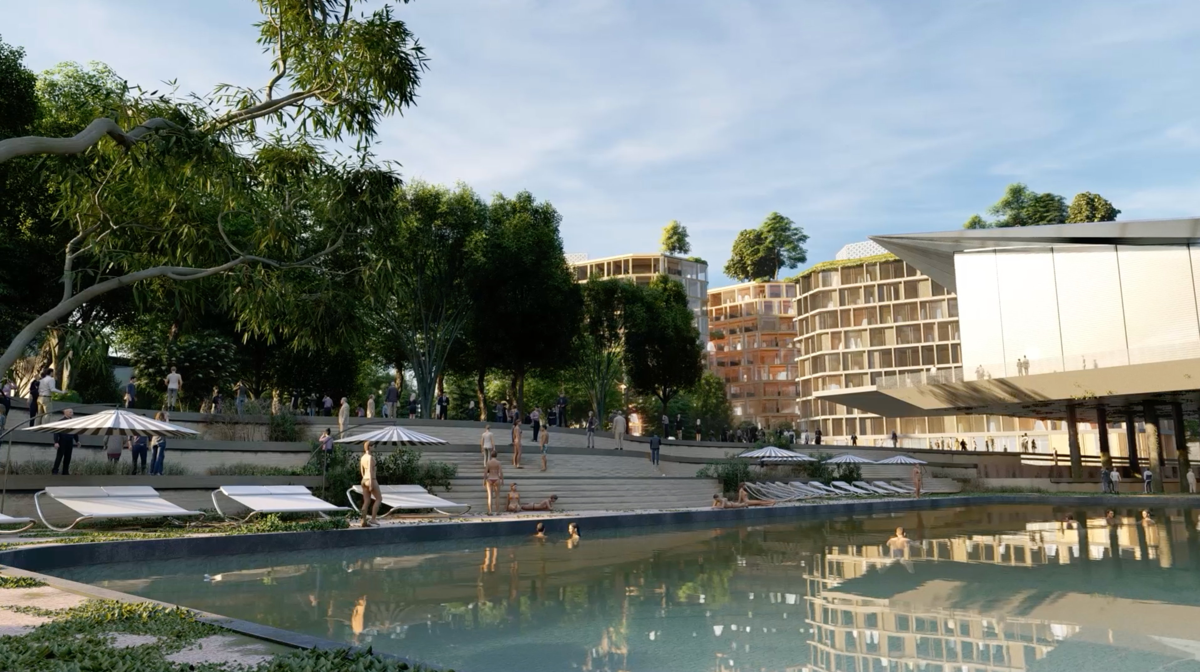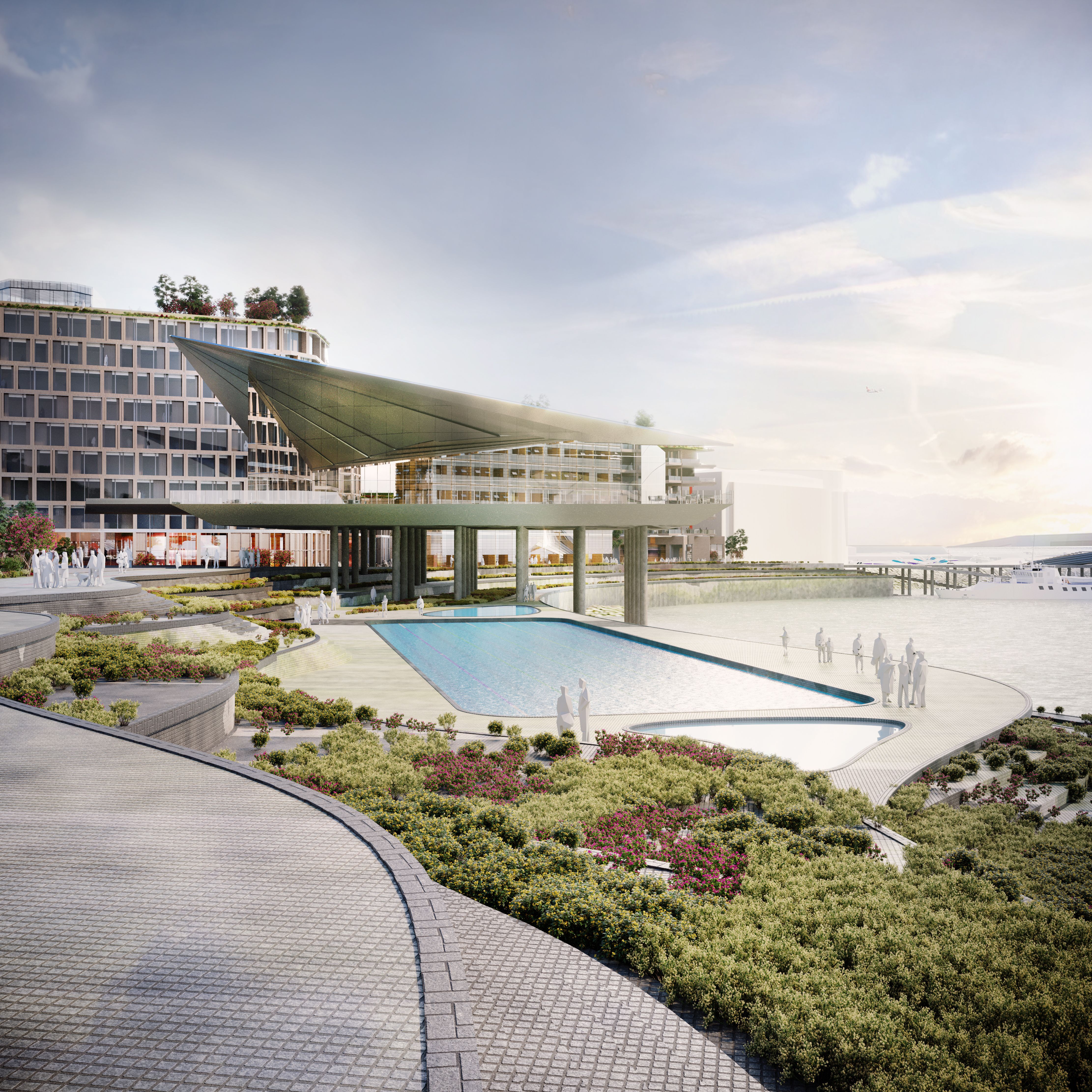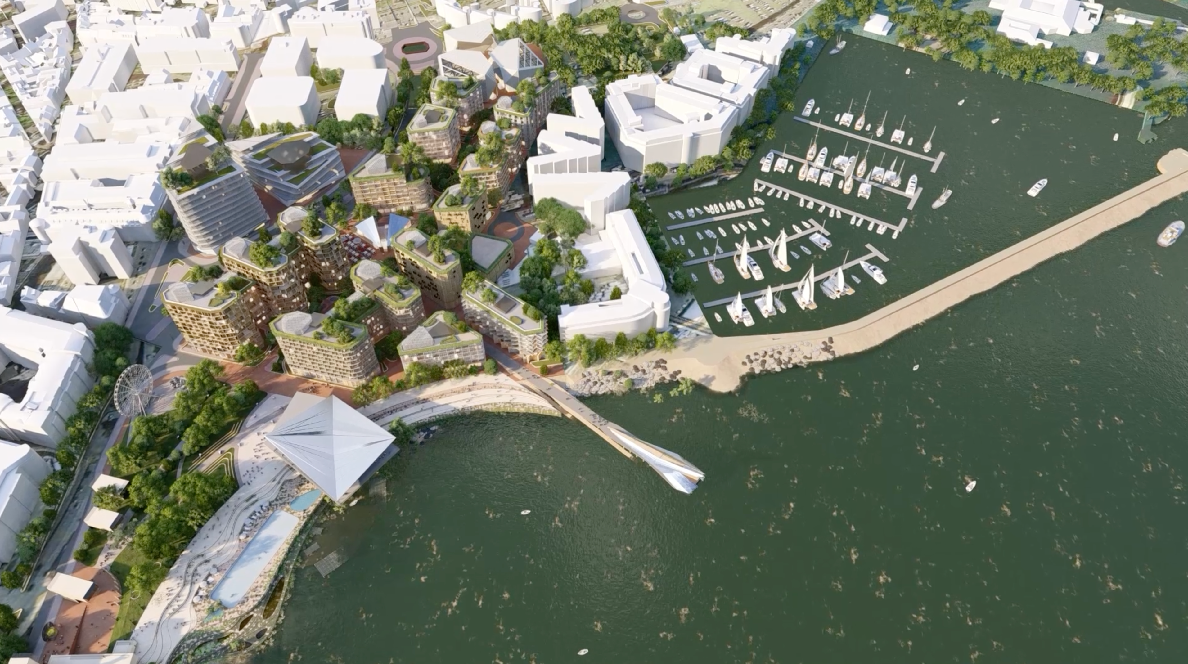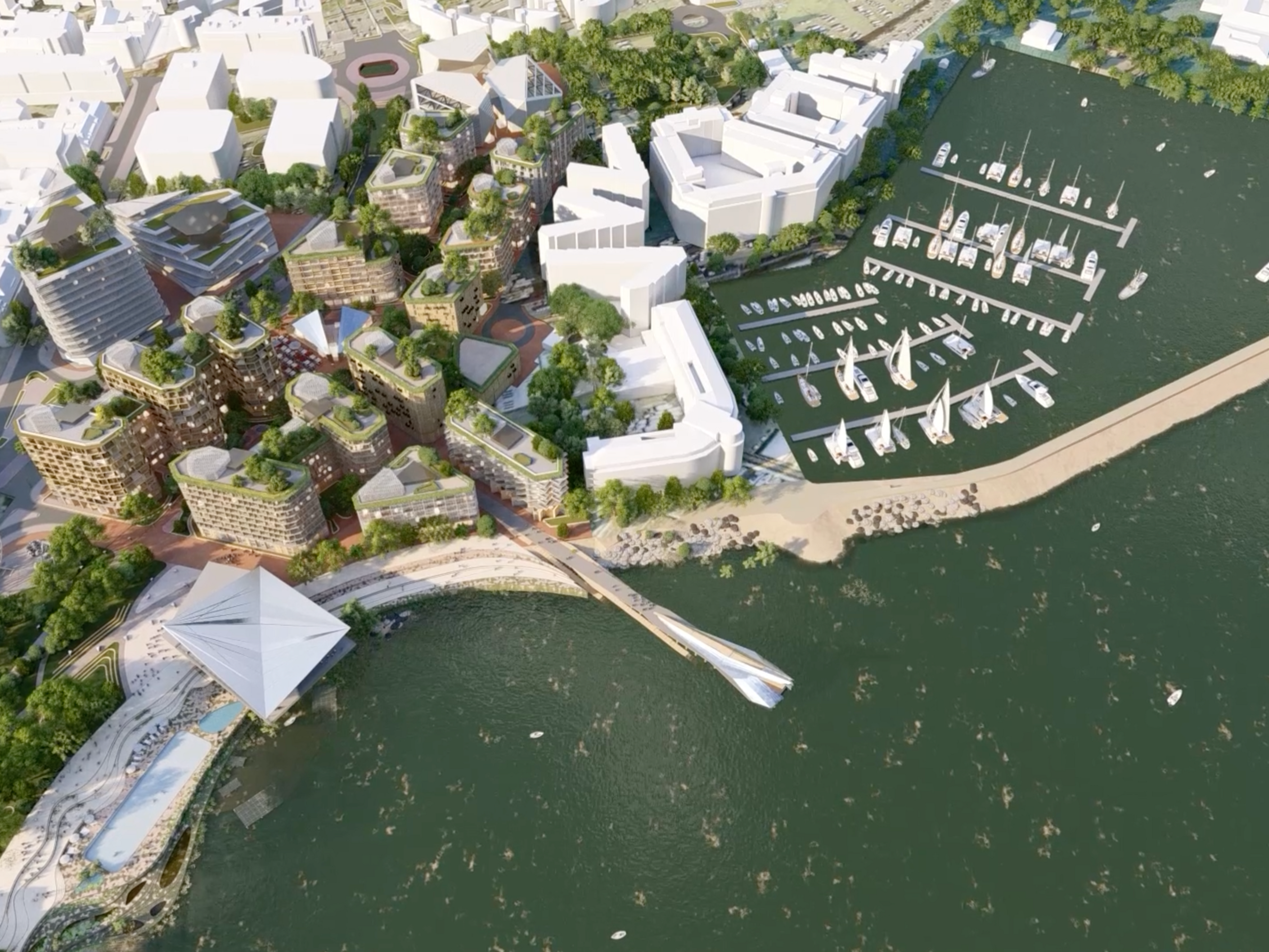 A green spine weaves its way through the new coastal neighbourhood, from Les Jardins de la Mer to the newly proposed Fountain Plaza, stringing together a sequence of unique open spaces and local amenities that define smaller communities within the whole. The patchwork of landscapes will be playful and functional, designed to encourage a diverse and multigenerational community to connect through nature.