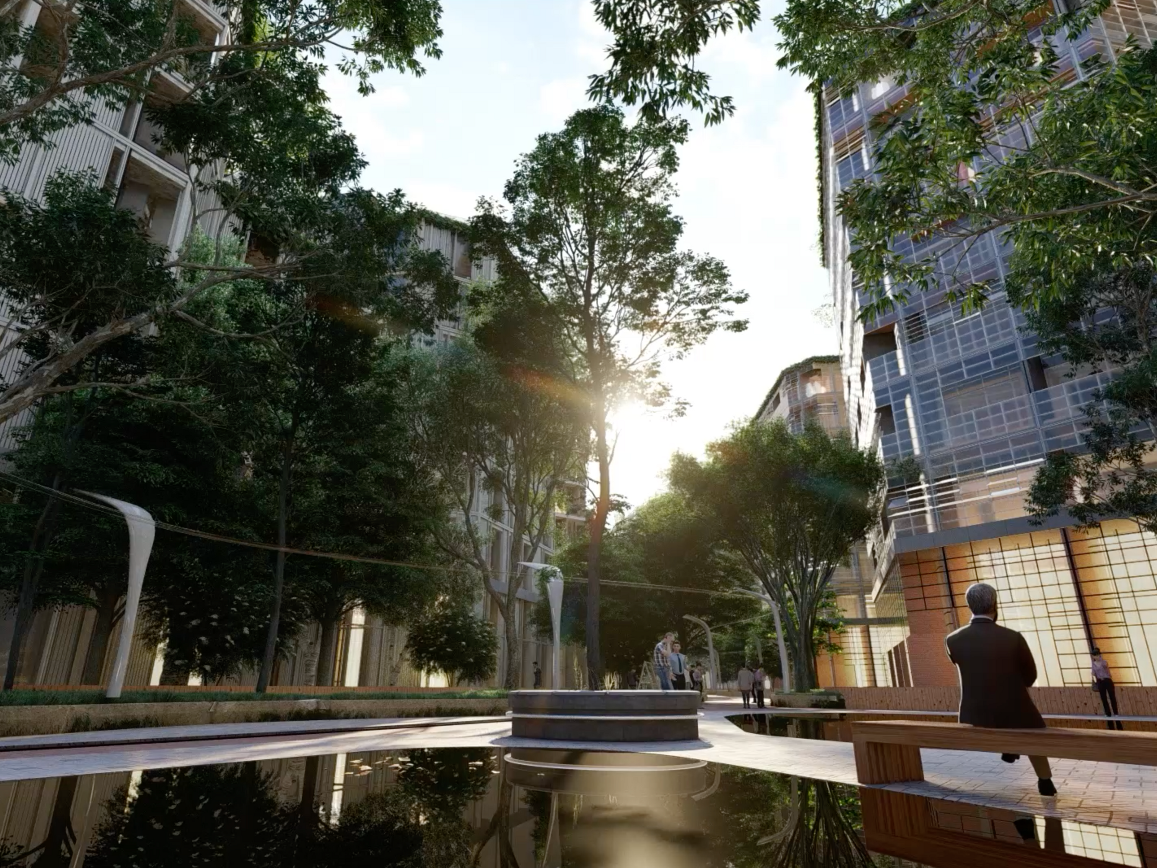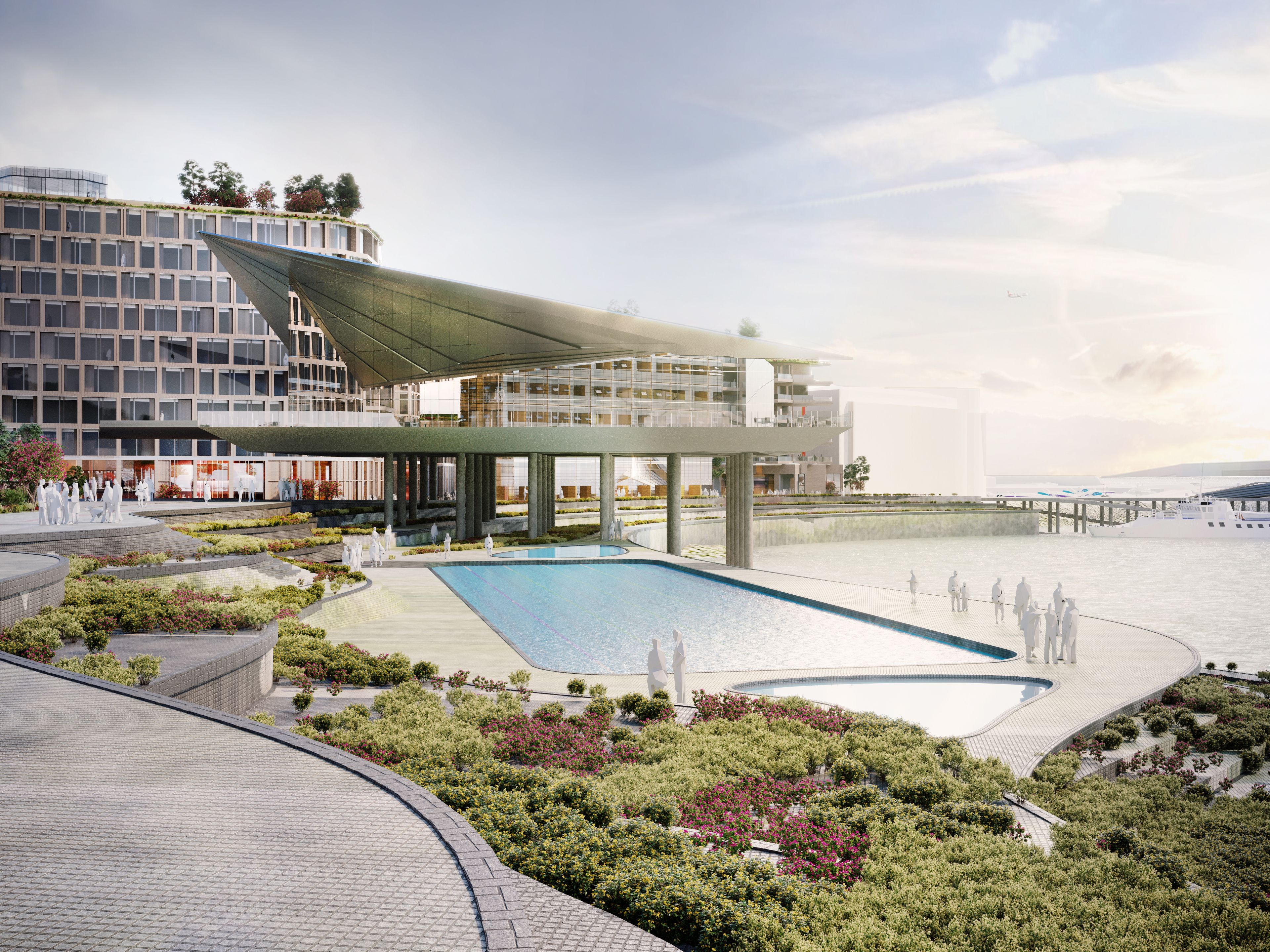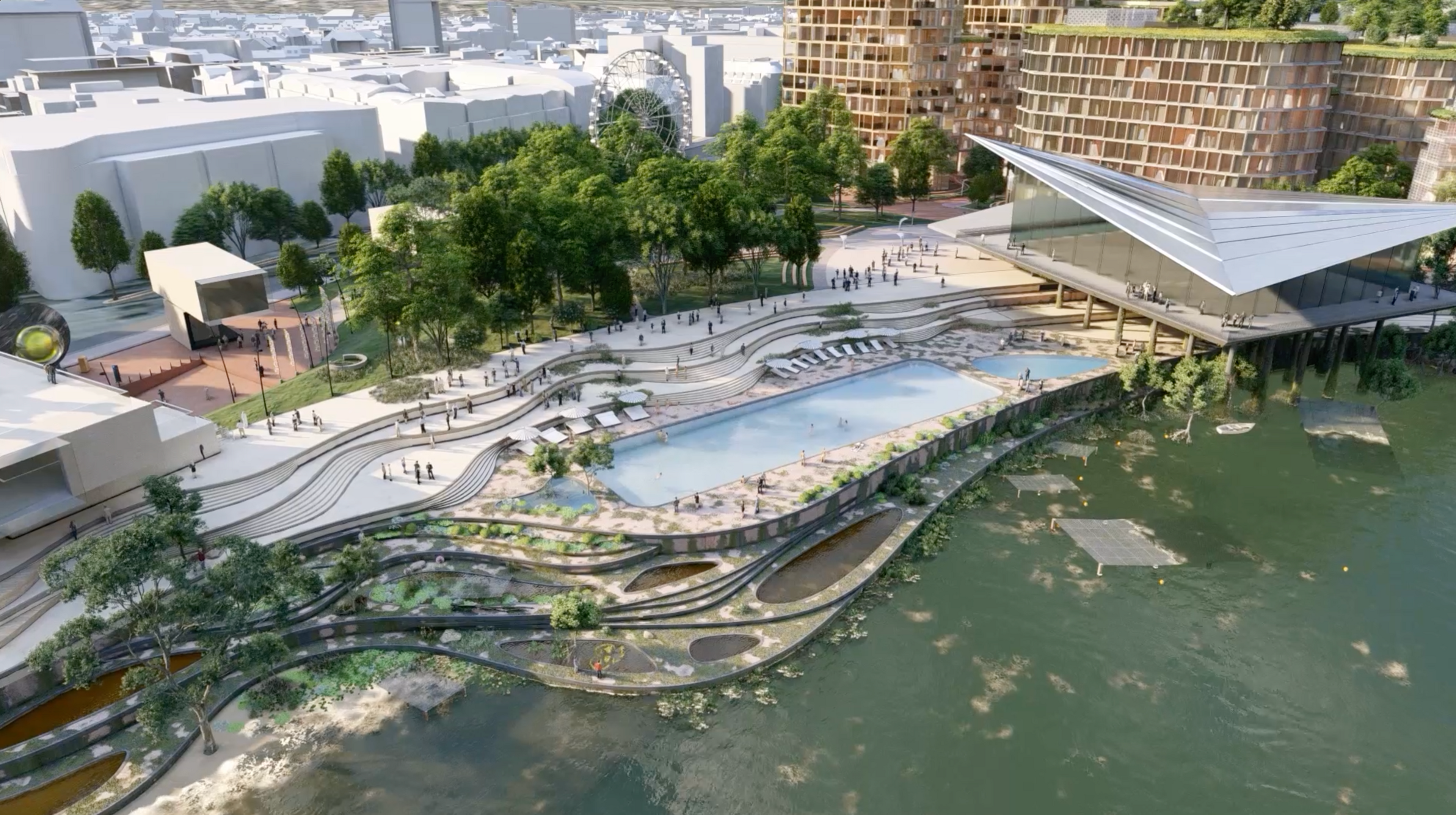 A green spine weaves its way through the new coastal neighbourhood, from Les Jardins de la Mer to the newly proposed Fountain Plaza, stringing together a sequence of unique open spaces and local amenities that define smaller communities within the whole. The patchwork of landscapes will be playful and functional, designed to encourage a diverse and multigenerational community to connect through nature.