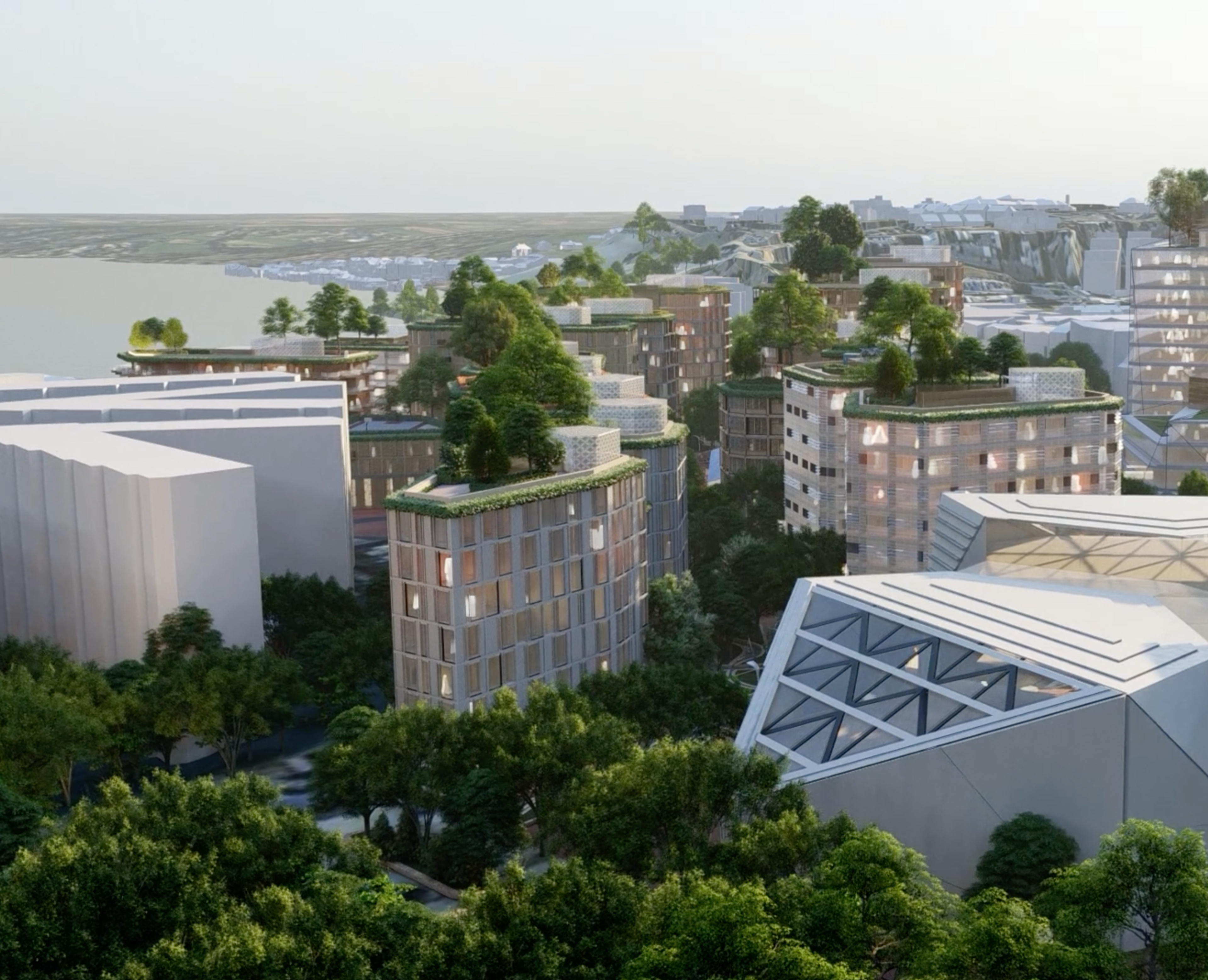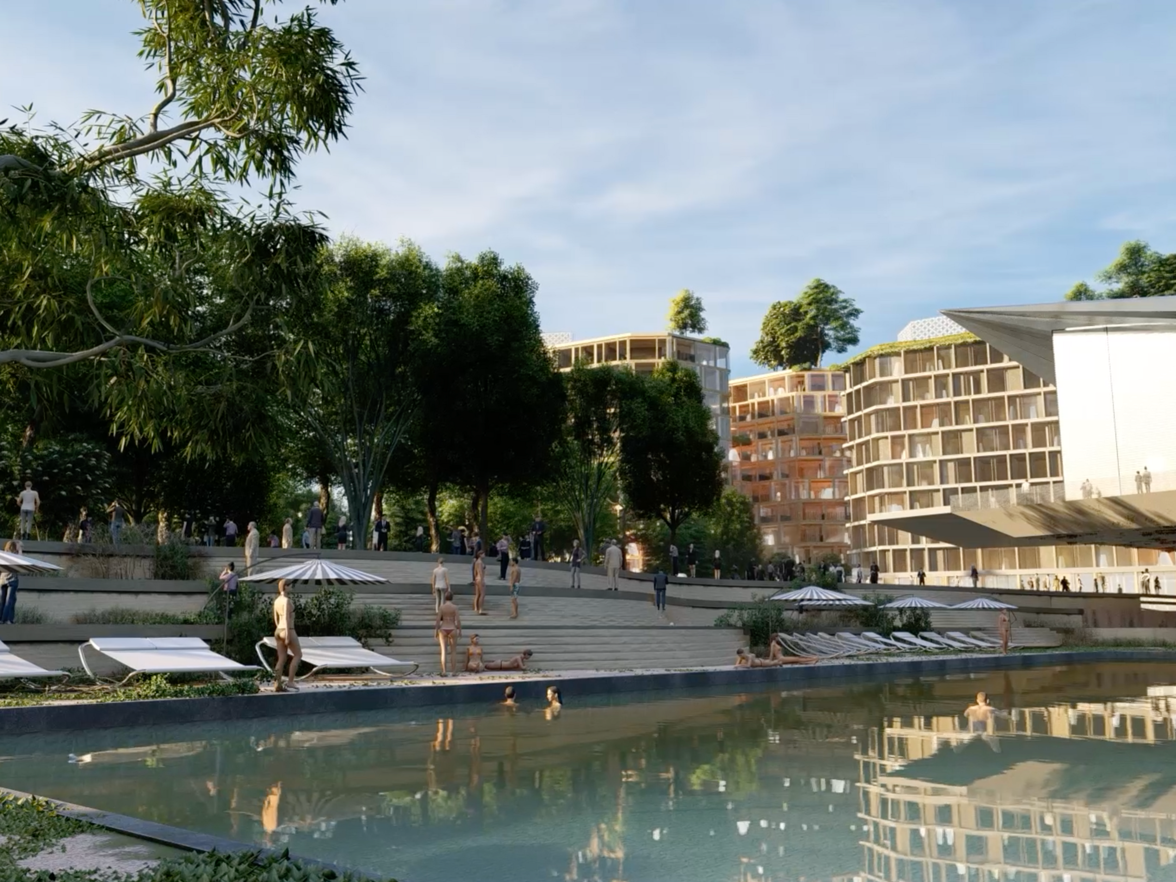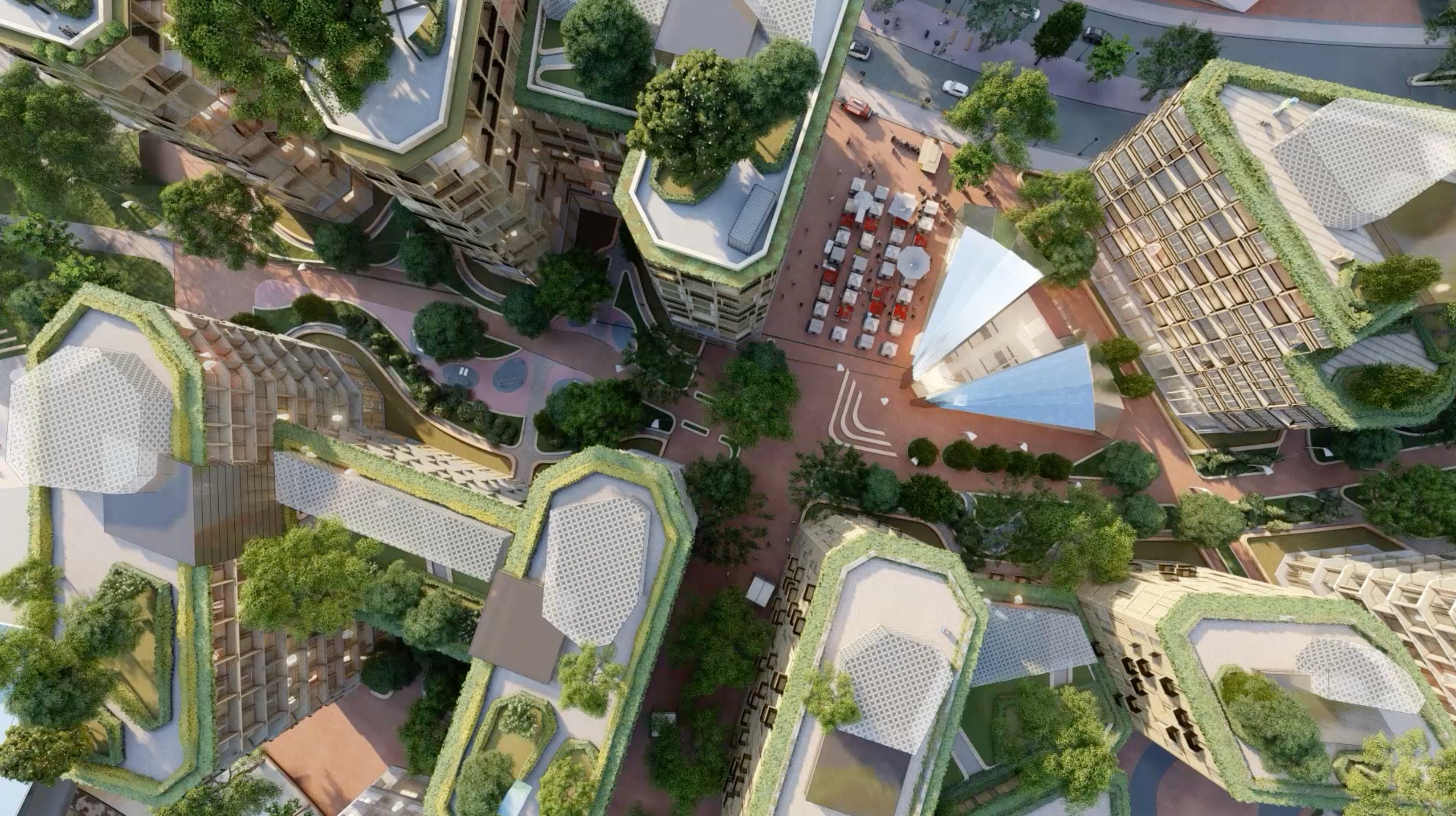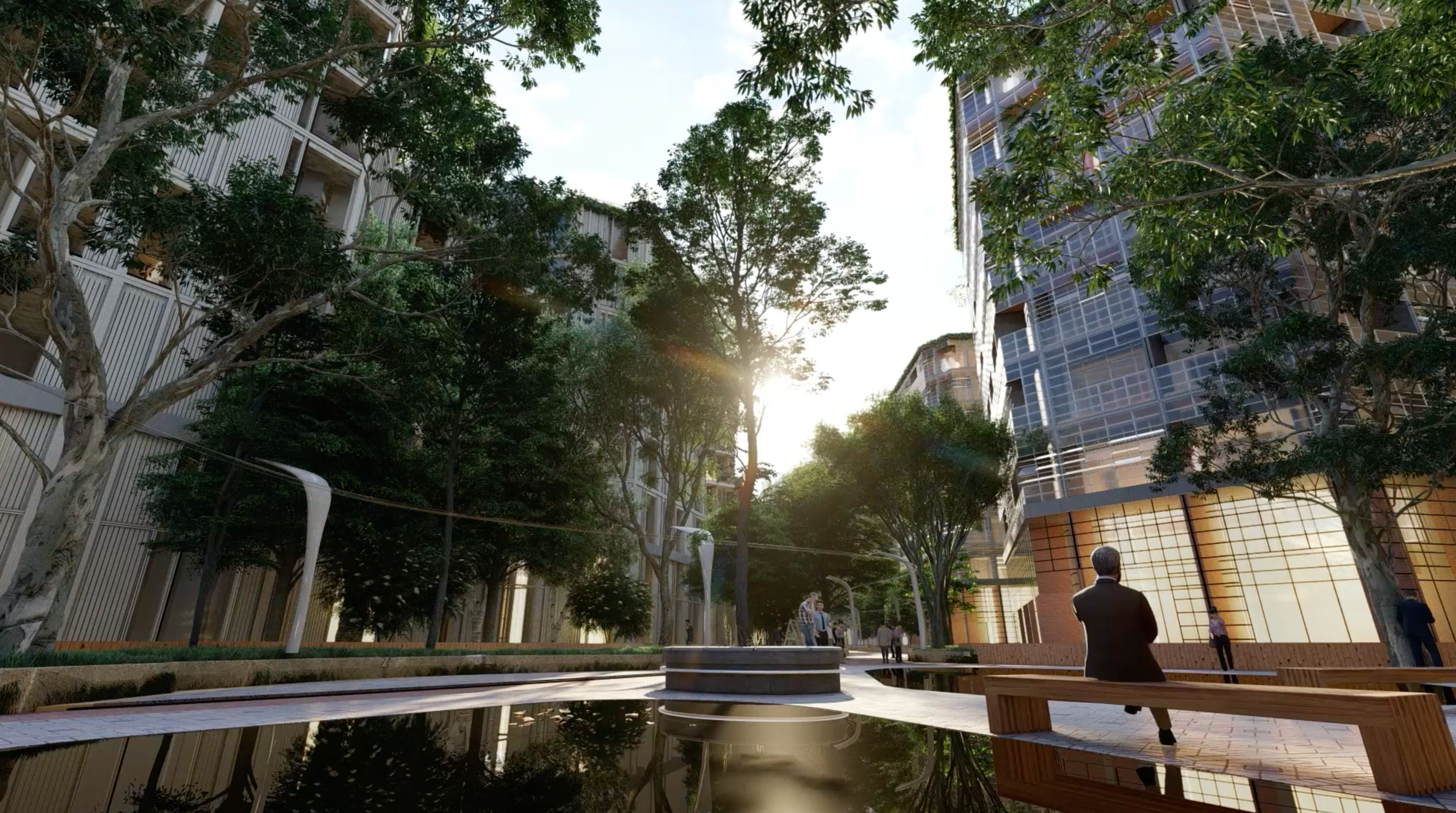 A green spine weaves its way through the new coastal neighbourhood, from Les Jardins de la Mer to the newly proposed Fountain Plaza, stringing together a sequence of unique open spaces and local amenities that define smaller communities within the whole. The patchwork of landscapes will be playful and functional, designed to encourage a diverse and multigenerational community to connect through nature.