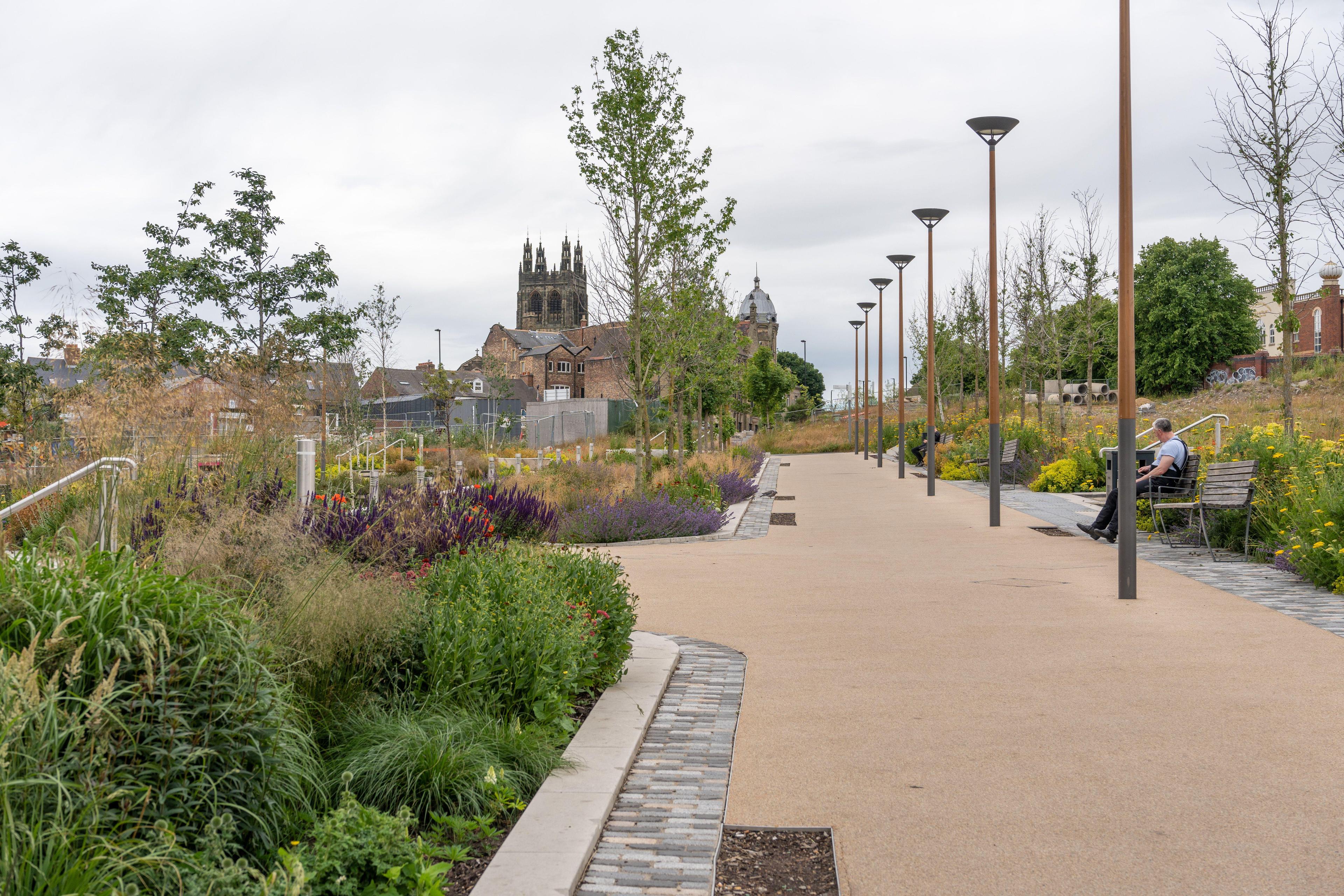 New pedestrian and cycling route to Science Square, a central green space within the Newcastle Helix district.